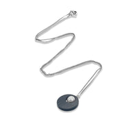 Elegance and sophistication, with a bit of something extra. Gorgeous as a statement pendant or layered with a simple chain for a more casual look. The speckled acrylic disc is the perfect partner for the shimmering glass pearl.