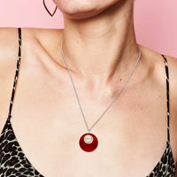 Elegance and sophistication, with added colour and fun. Gorgeous as a statement pendant or layered with a simple chain for a more casual look. The coloured acrylic disc is the perfect partner for the shimmering glass pearl.