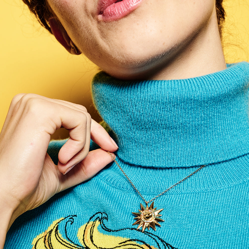The Sunburst collection includes five beautiful pendant necklaces, including the Hero of the bunch - the Cool Rainbow. Drawing on our Mood Collection's most popular face, a pair of cat-eye sunglasses form the centre of the sun, ringed by a beautiful rainbow of coloured cubic zirconia.