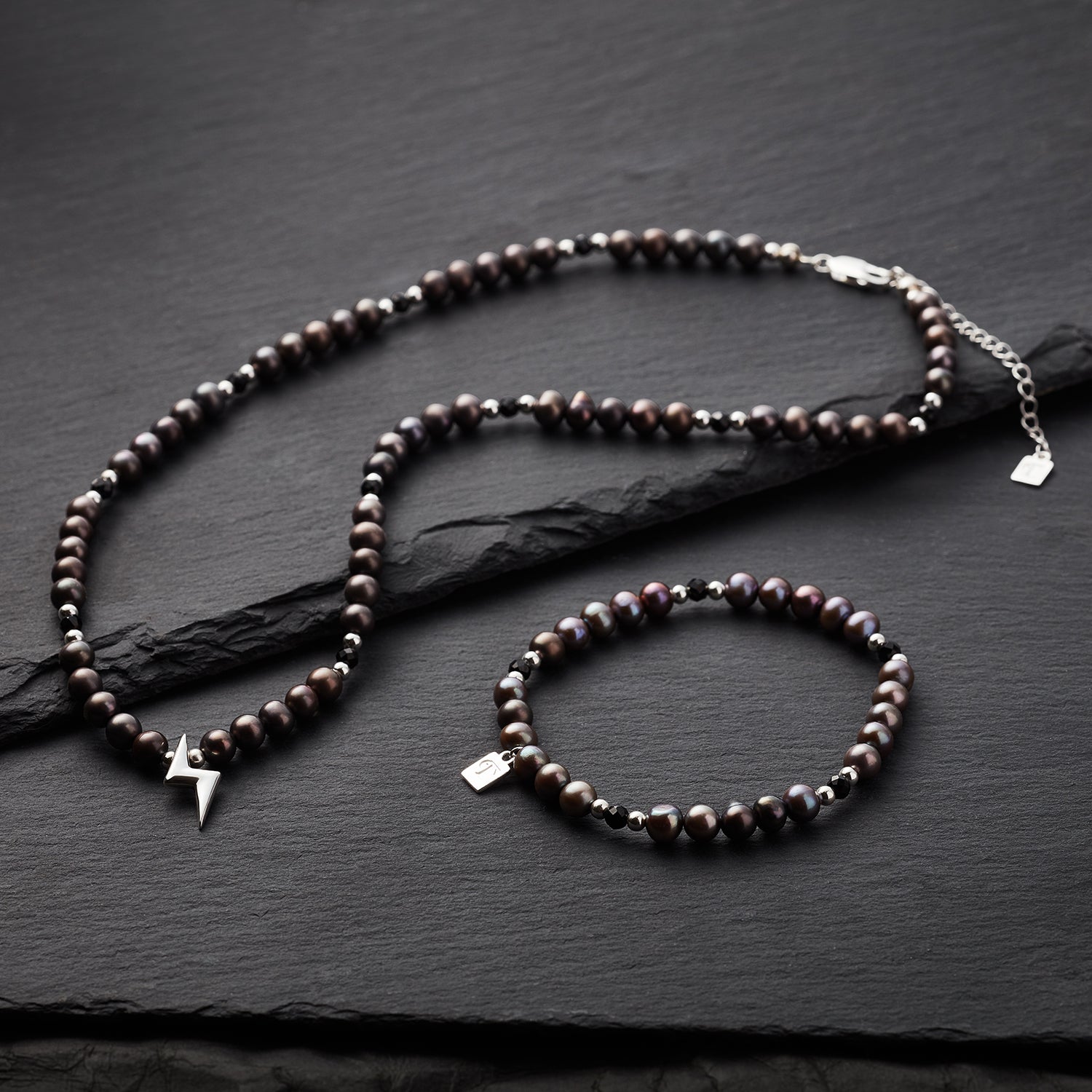 Dark, iridescent peacock pearls have been selected alongside beads of black onyx in this unique choker. A central gold vermeil bolt pendant brings this striking piece together.
