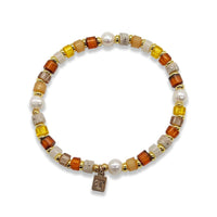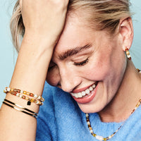 Express yourself with this joyous bracelet in cosy autumnal colours. Made with shimmering freshwater pearls and studio-cut acrylic discs, your new favourite accessory is hand-threaded in our studio. Wear it solo or layer with a selection of our other bracelets for a kaleidoscope of colour.