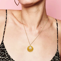Elegance and sophistication, with added colour and fun. Gorgeous as a statement pendant or layered with a simple chain for a more casual look. The coloured acrylic disc is the perfect partner for the shimmering glass pearl.