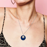 Elegance and sophistication, with added colour and fun. Gorgeous as a statement pendant or layered with a simple chain for a more casual look. The coloured acrylic disc is the perfect partner for the shimmering glass pearl.