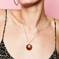 Elegance and sophistication, with added colour and fun. Gorgeous as a statement pendant or layered with a simple chain for a more casual look. The coloured acrylic disc is the perfect partner for the shimmering glass pearl.
