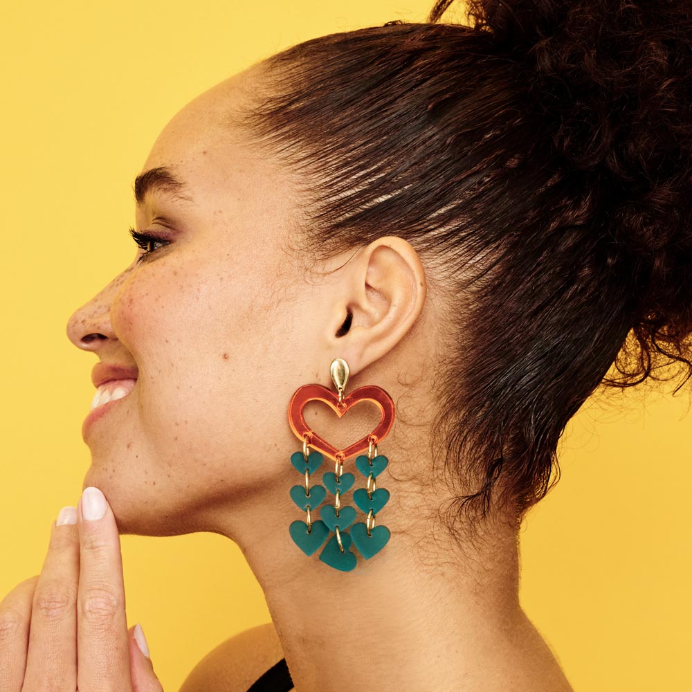 Our hearts skipped a beat in a big way when we fell in love (at first sight) with our bold Heart Chandeliers. BIG on dramatic impact but also lightweight, we see them bringing the statement charm to daytime looks or turning up the glamour for BIG nights out.